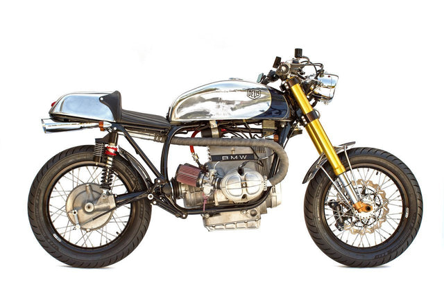 You are looking at a creation from Woolie's Workshop. It's a late 1970's BMW R100S café racer build. The R100S is a bit of a legendary bike and it's hard to cut it up so for this project Woolie set out to make something that's already working really well work differently. The inspiration behind this bike was to build something that didn't look very much like a BMW," says Woolie. I tried to change the look of it and to style it around something that was a bit older than the bike was." Woolie goes on to describe the build. It's got a big tank and you're all stretched out, so you really feel like you're tucked in behind it." Compared to the original bike, this build possesses a more aggressive riding position, but it's still very comfortable to ride and very smooth with great power delivery. The frame has been deconstructed‚ Woolie removed all the brackets, the sub-frame, and sub-frame mounts and hand built a new chromoly sub-frame. The battery has been relocated under the seat with a 1200-degree heat shield protecting it from the engine. The Rear brake was converted from a disc to a drum. Handmade componentry is pretty much everything on the bike: the foot controls, rear sets, front and rear fenders, seat, tank, brackets, headlight mounts, brackets, and tacks. Our friend Pierre Vallaincourt at Works Performance engineered the rear suspension. The √ñhlins forks were shortened and re-valved by Ed Sorbo at Lindemann Engineering. The handlebars, bar mounts, and mirrors come courtesy of all of our partners at Rizoma. "It's a fun bike," Woolie declares. "It's a bit faster than I actually expected. It's definitely a one off. There's only ever going to be one of these."